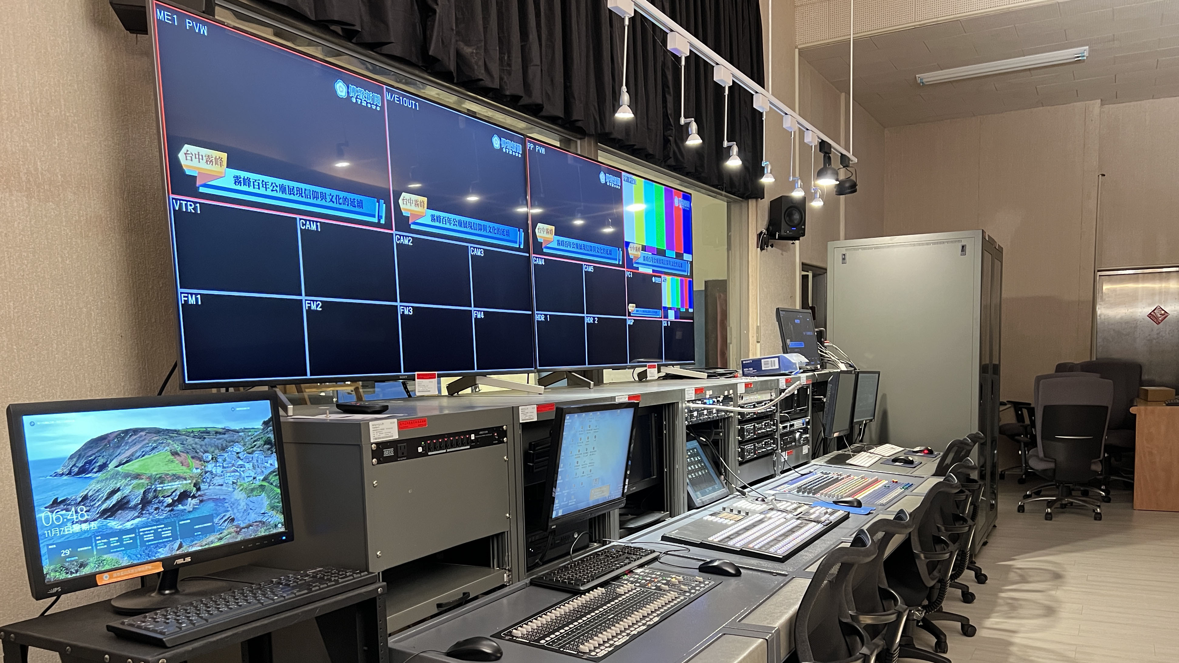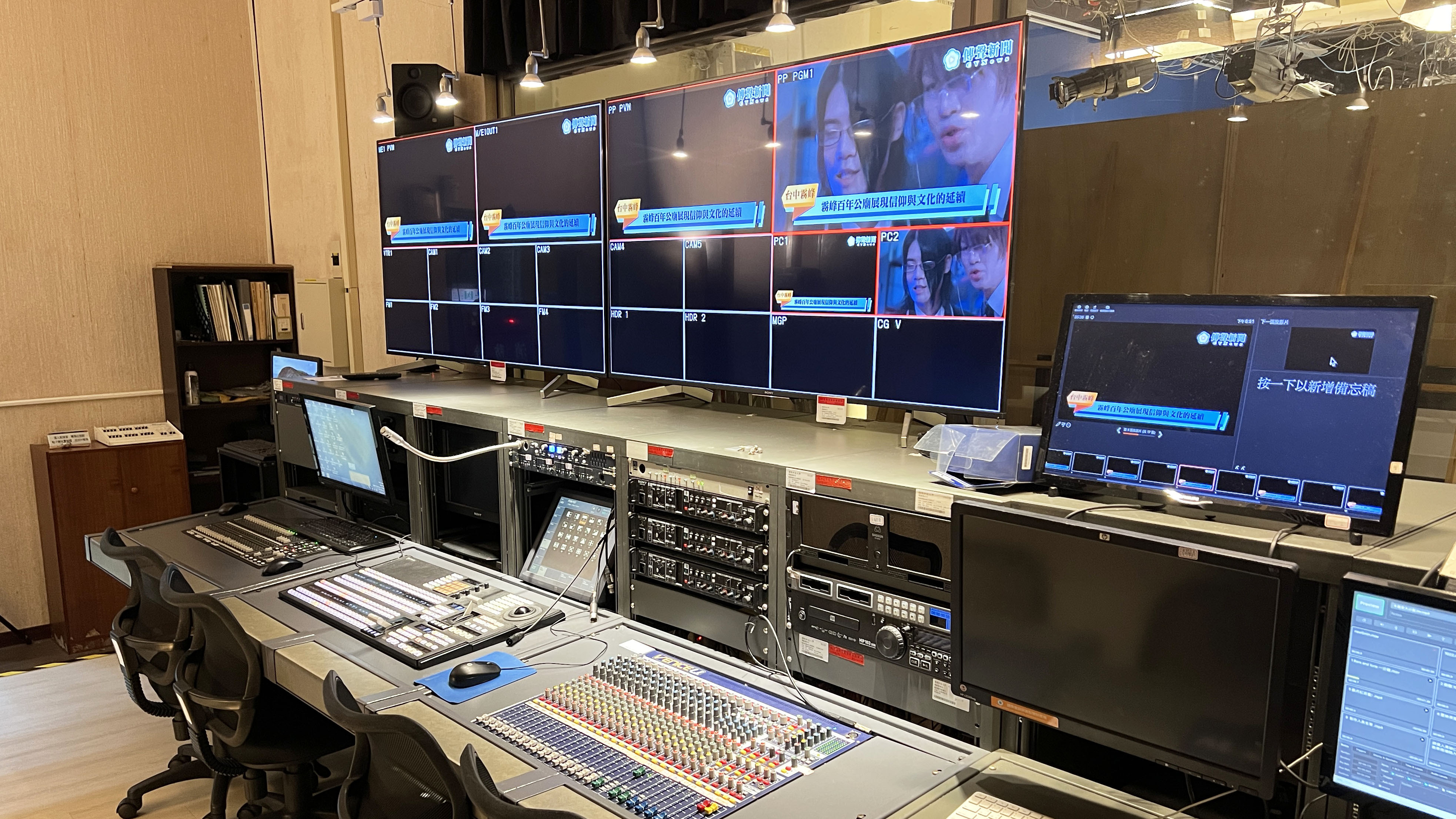 SONY MVS-3000 導播機 SONY HKCU-FP2 CCU控制面板*3 SONY 65吋液晶電視*2 VOXEL ICG-3000HD-E字幕機 VOXEL MGP-1000HD-LE 媒資儲存系統 ADJ SCENE-SETTER 48調光控制器 SHURE無線麥克風 24路數位混音器 讀稿機播放系統 BlackmagicDesign 固態硬碟錄放影機 Atomos 雙七吋4K Monitor / Recorder Apple MacPro電腦 Apple iMac電腦 |